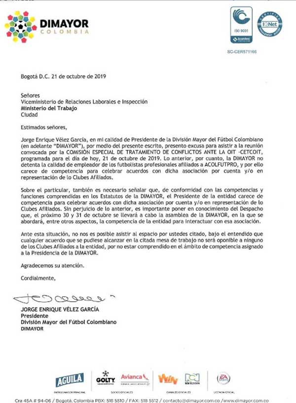 Por medio de una carta dirigida al viceministro de Trabajo, Carlos Baena, el presidente de la Dimayor, Jorge Enrique Vélez, expresó las razones que lo llevan a no asistir al encuentro para buscar una salida y evitar el paro.